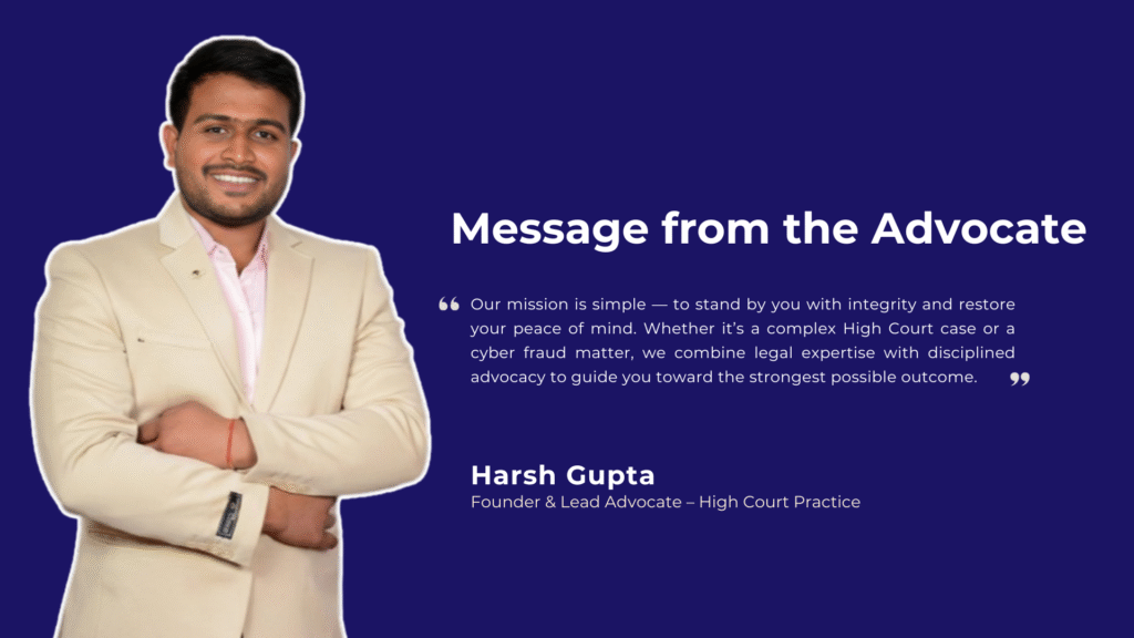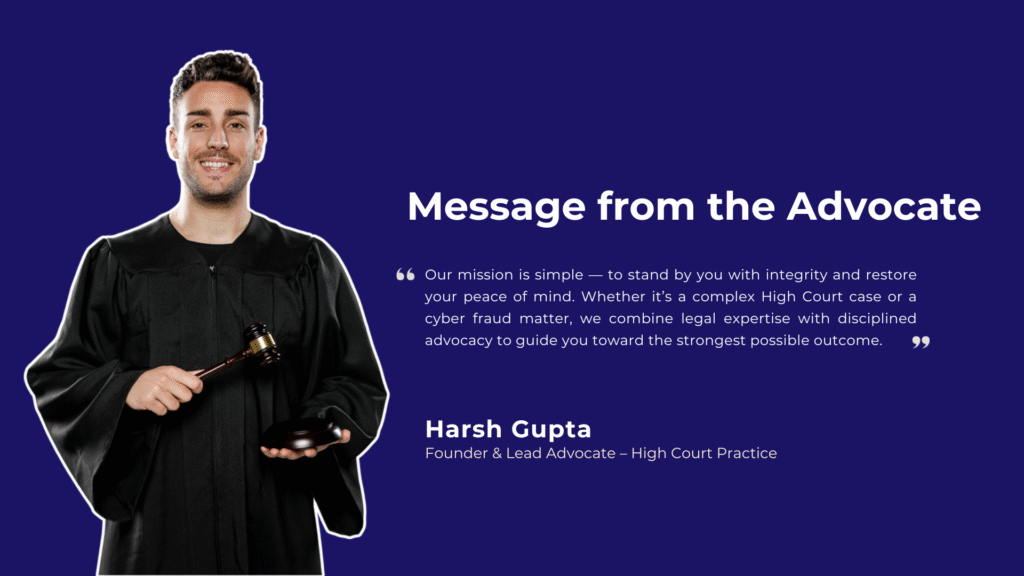 We handle High Court matters, cyber crime cases, civil disputes, criminal matters, property issues, and appellate litigation.